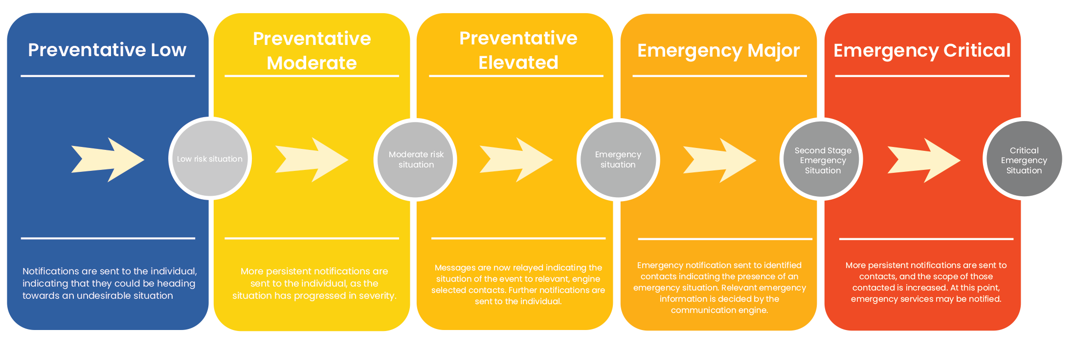 Messages begin as preventative efforts, with notifications being sent to the individual. If the situation escalates, these notifications become more persistent and ultimately as the risk becomes increasingly elevated contacts are identified and notified of the situation.